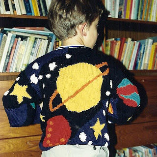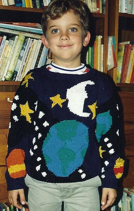 I still have the sweater. You don’t just toss out the universe when someone “outgrows” it, or because it’s “too itchy” to wear more than once. The boy I made it for is a grown man now. He vaguely remembers the sweater, but I see it every day, captured in a photograph. A tolerant young boy, hands at his sides, well-aware of the gross injustice imposed on him by having to wear this sweater.