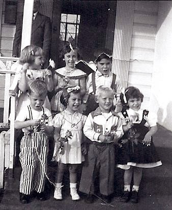 At my birthday party. John is standing next to me in those crazy striped pants.