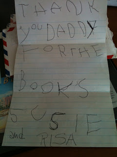 Awwww. This is the thank you note I mentioned earlier — the one my sister and I sent to my dad. It was tucked inside the envelope with my mom’s letter to him. A pretty good signature for a not-quite-three year old! ( I may have had some help.) My sister Susie and I found a packet of letters –23 in all — written between June 29th and August 7th, 1954. (Postage: 6 cents for airmail.) My mom and sister and I were camped out at my maternal grandparents’ small apartment in Detroit for several weeks while my dad stayed in New York, doing his coursework at Columbia.